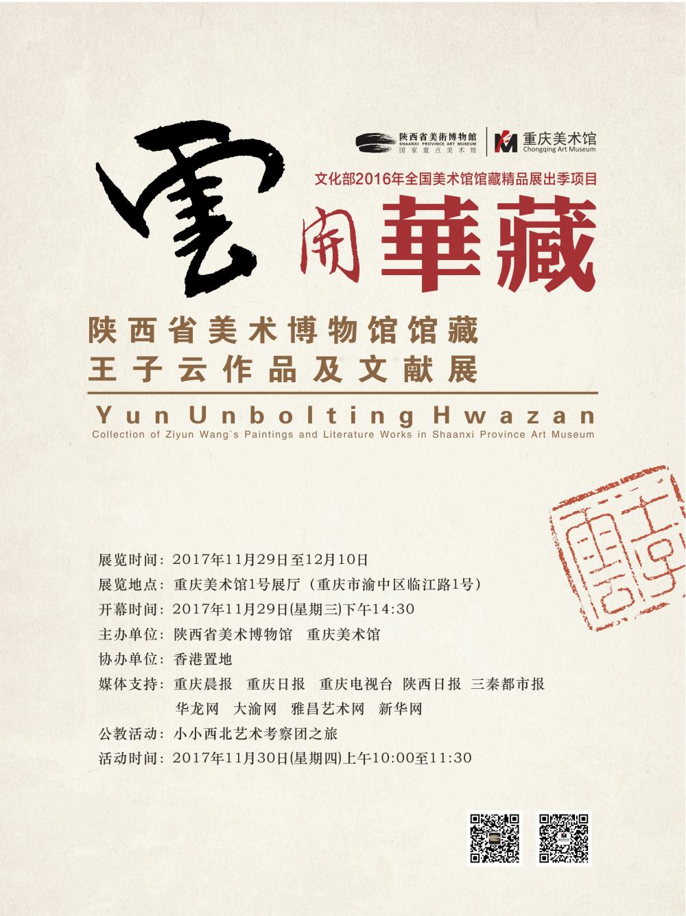 主办单位:陕西省美术博物馆、重庆美术馆 协办单位:香港置地 展览时间:2017年11月29日—12月10日 展览地点:重庆美术馆1号展厅 开幕式:2017年11月29日 14:30 学术讲座:2017年11月29日 15:30 (讲座主题:“文化的力量——从重庆出发的艺术考古伉俪”?!霸瓶亍挛魇∶朗醪┪锕莨莶赝踝釉谱髌芳拔南渍埂庇?016年8月在西安展出后,获得文化部“2016年全国美术馆馆藏精品展出季优秀展览巡展扶持项目”,并于今年3月在王子云生活和学习过的杭州拉开全国巡展的帷幕。